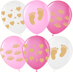 Шар (12''/30 см) Новорожденный для девочки(сердца и облака), Ассорти, кристалл, 5 ст, 25 шт.