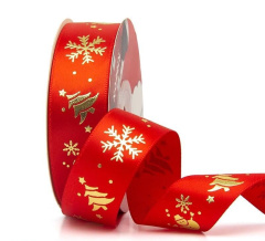 Лента атласная (2,5 см*22,85 м) Красный, Снежинки, 1 шт.