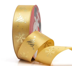 Лента атласная (2,5 см*22,85 м) Золото, Снежинки, 1 шт.