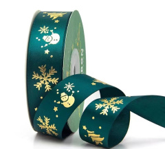 Лента атласная (2,5 см*22,85 м) Зеленый, Снежинки, 1 шт.